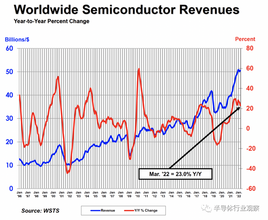 半導體行業(yè)協(xié)會 (SIA) 統(tǒng)計數(shù)據(jù)顯示,2022年第一季度全球半導體銷售額達到 1517億美元,較去年同期增長23%。但比2021年第四季度低0.5% 。2022年3月全球銷售額為506億美元,環(huán)比增長1.1%。